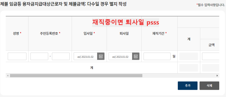 퇴직자는 퇴직급여를 작성하시고 재직자는 "0"을 입력하시면 됩니다.